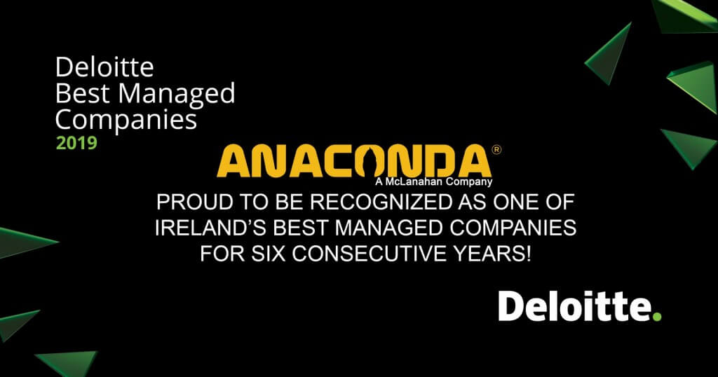 “Being recognized by Deloitte once again this year as one of Ireland’s Best Managed Companies as we re-qualify for the 6th year in a row is a testament to the hard work the entire team at Anaconda put in day after day.  They say it takes a strong and disciplined army to win a war, that couldn’t be more true, and it’s the Anaconda teams continued diligence and focus on customer support and service that has us winning the proverbial war and growing from strength to strength each year.   Great work by all and I look forward to seeing what we can achieve in the coming year.”